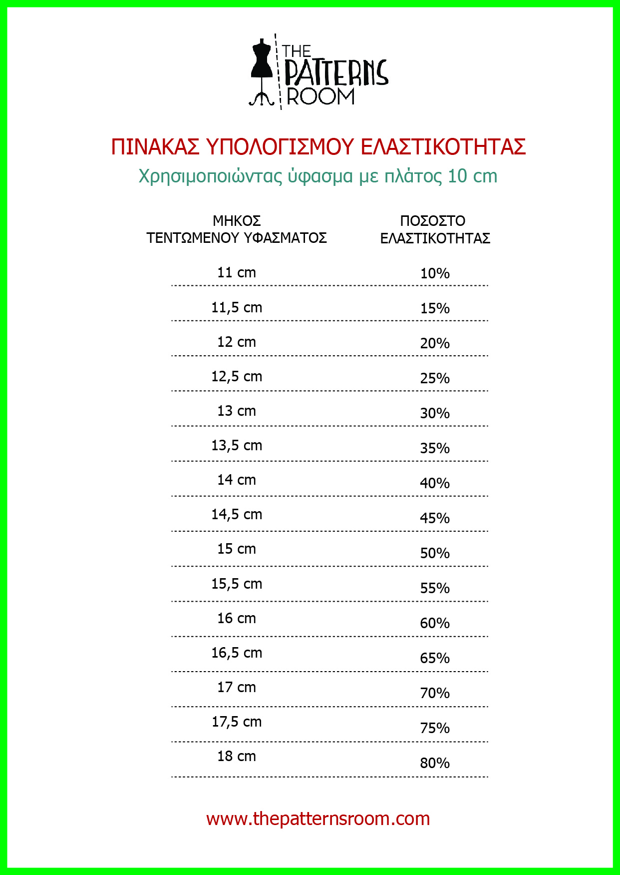 Εν συντομία, το ποσοστό ελαστικότητας ενός υφάσματος είναι το πόσο τις εκατό μπορεί το ύφασμα να τεντωθεί (μεγαλώσει) από το φυσικό του μέγεθος. Όταν το υπολογίσετε σε ένα μικρό κομματάκι, εδώ προτείνουμε τα 10 cm, το ίδιο θα ισχύει για όλο το ύφασμα σας.